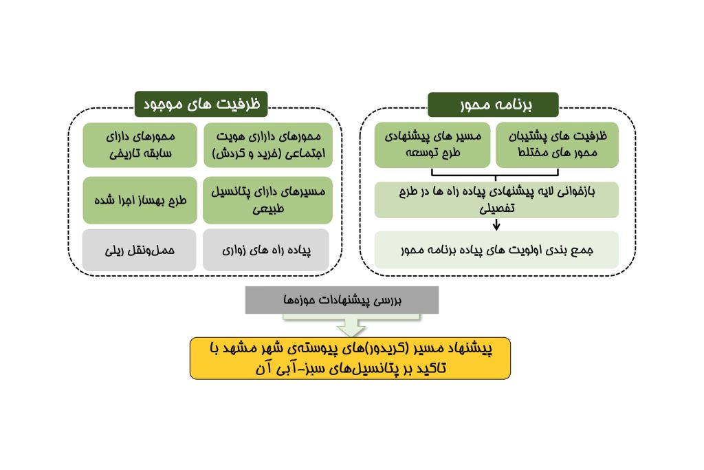 کریدور پیاده بستر شکلدهی به شبکه پیاده شهر تعریف میشود. براین اساس کریدور پیاده مسیر پیوسته و منطبق بر لنگرگاههای کالبدی-عملکردی شاخص شهری-منطقهای است که میتواند تنوعی از مداخلات از جمله تعریف پیادهراه، ساماندهی و تجهیز پیادهرو، تعریف محور با اولویت پیاده و پارکها و مسیرهای سبز خطی را به فراخور پتانسیلهای موجود و طرحهای پیشنهادی در خود داشته باشد. در این مطالعات کریدورهای پیاده با در نظرگرفتن اصول ذیل پیشنهاد شدهاند: حرم مطهر به عنوان کانون متمرکز و اصلی توسعه و تعاملات اجتماعی-تاریخی درکلانشهر مشهد در نظر گرفتن لنگرگاههای کالبدی-عملکردی شاخص متصل به ظرفیتهای محوری موجود در پیشنهاد مسیرها (پارکهای شهری، پایانه، دانشگاه و ...) در نظر گرفتن اولویتهای برنامهای (طرح جامع و تفصیلی) انطباق حداکثری با قابلیتهای عناصر خطی وضع موجود (محورهای دارای هویت اجتماعی (خرید و گردش)، محورهای دارای سابقه تاریخی، مسیرهای دارای پتانسیل طبیعی) اولویت بهرهمندی از ظرفیت کال و مسیل تاکید بر پیوستگی مسیر به منظور پرکردن حلقههای گمشده شهری