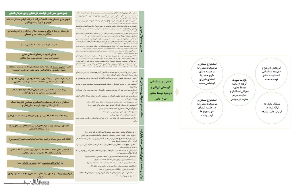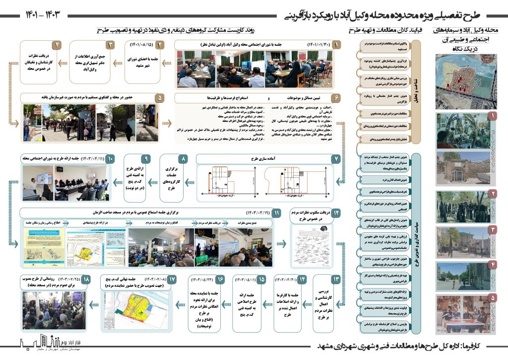محله وکیل‌آباد، سکونتگاهی کهن با سرمایه اجتماعی، فرهنگی و تاریخی‌ست که متاسفانه امروزه با مشکلات متعددی در ابعاد مختلف اقتصادی، حقوقی، کالبدی، دسترسی، زیرساختی و ... دست به گریبان است. مشکلاتی همچون وجود مسائل مالکیتی، ضعف در اتصال محله به ساختار فضایی شهر مشهد، کمبود خدمات محلی، مسائل مرتبط با تراکم ساختمانی و ... سبب شده تا محله دچار بحران جدی برای بقاء و توسعه خود گردد و به عنوان یکی از "بافت‌های ناکارآمد شهر مشهد" شناخته شود. موقعیت استراتژیک این محله (باتوجه به مجاورت‌های آن) در کنار فرسودگی کالبدی آن سبب شده تا در دوره‌های مختلف شاهد رویکردهای متفاوت و گاها متناقض باشد. اگرچه در طول زمان رویکردهای شهرسازی نسبت به محله تغیییر یافته (از نگاه بولدزری و تخریب کامل بافت به رویکرد حفاظتی)، اما غلبه‌ی نگاه کالبدی در تهیه طرح‌های اخیر نیز سبب شده تا اجراء این طرح‌ها با مشکلات اساسی در حوزه تملک اراضی، تامین سرمایه، عدم رضایت ساکنان و ... روبرو شود. با پذیرش نقش سکونتی محله در طرح جامع سوم (1395)، در طرح تفصیلی حوزه جنوب غربی (1400) ساختار اصلی محله حفظ شد. با عنایت بر مشکلات ذکرشده و عدم رضایت ساکنان از پیشنهادات طرح‌های پیشین، در اسفندماه 1400 قراردادی با کارفرمایی اداره کل دفتر طرح و مطالعات شهری شهرداری مشهد تحت عنوان "طراحی شهری محله‌ی وکیل‌آباد مشهد با رویکرد بازآفرینی شهری پایدار"، با این مهندسان مشاور منعقد گردید. برای نیل به این هدف مطالعات این مشاور در شش مرحله ارائه شده است. در مرحله یک، با هدف دستیابی به چشم‌انداز مقدماتی به بررسی چشم اندازهای گذشته و موجود، بررسی اسناد بالادست مرتبط با محدوده، بررسی نظرات ذی‌نفعان و ذی‌نفوذان و پیشینه نظری و عملی پرداخته شده است. در مرحله دو، مطالعات شناخت و تحلیل در حوزه های راهبردی و محلی و در دو بعد رویه‌ای و ماهوی انجام شده است. در مرحله سه، به دنبال ایجاد تصویر یکپارچه از محله و استخراج ظرفیت‌های موجود تحلیل یکپارچه و ظرفیت‌سنجی محله (به تفکیک جمعیت، خدمات و تراکم) انجام گردیده است. در مرحله چهار، با توجه به سنجش وضعیت صورت گرفته در گام قبل، چشم انداز آغازین تدقیق شده و اهداف کلان، خرد و سیاست‌های طراحی تبیین شده است. در مرحله پنجم به دنبال تدوین سیاست‌های طراحی، سناریوهای طراحی تدوین و گزینه رضایت‌بخش انتخاب و الگوهای فرم شهری تدوین گردیده است. طرح تفصيلي محله وکیل‌آباد تهیه و ضوابط و معيارهاي طراحي شهري خاص محله ارائه شده است. در گام ششم، به منظور تضمین تحقق‌پذیری پیشنهادات ارائه شده الگوهای جذب مشارکت مردمی، پروژه‌های محرک توسعه و مرحله‌بندی اجرای پروژه مشخص گردیده است.